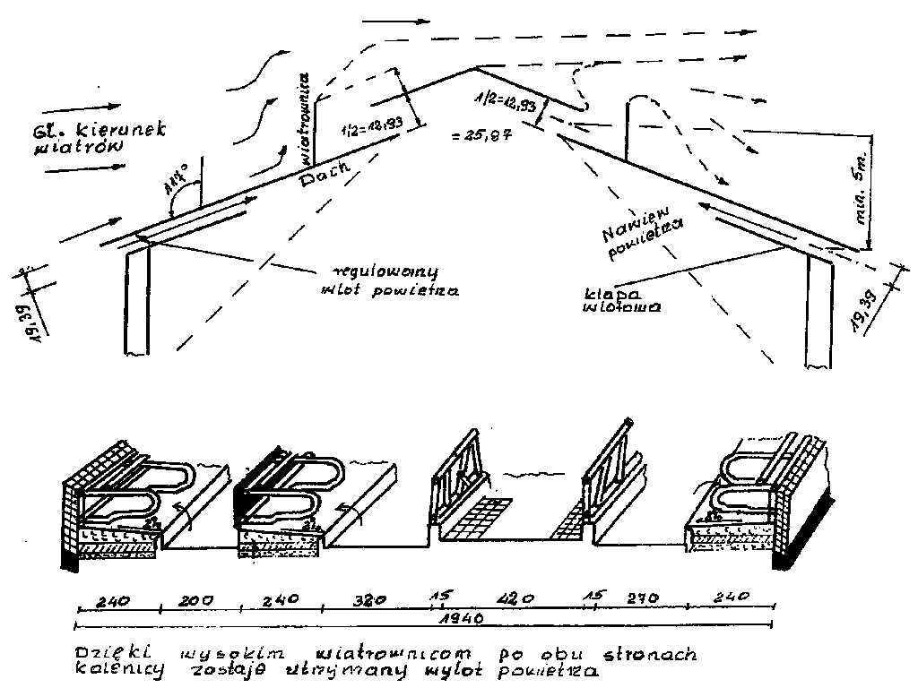Dodatkowo każdy naturalny system wentylacyjny powinien składać się z otworów doprowadzających i otworów wyprowadzających powietrze, oraz wysokich wiatrownic po obu stronach kalenicy, dzięki którym zostanie utrzymany wylot powietrza. Następnie trzeba zachować różnicę wysokości usytuowania wlotu i wlotu na poziomie - 5 m (rys. 1.).